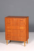 Une élégante commode moderne du milieu du siècle, fabriquée en teck massif, au design distinctif évoquant les années 1960 et 1970. Ce meuble séduit par sa forme intemporelle et sa qualité de fabrication exceptionnelle – un classique qui sublimera n'importe quelle pièce. Ses tiroirs spacieux offrent un grand espace de rangement, tandis que le veinage chaleureux et l'élégance discrète du teck lui confèrent une beauté intemporelle. Une pièce authentique de mobilier vintage, idéale pour les collectionneurs et les amateurs d'intérieurs classiques.